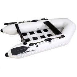 Cette annexe est équipée de deux anneaux de remorquage pour faciliter son transport derrière votre bateau principal. Son plancher à lattes de 15 cm offre un confort supplémentaire lors de vos sorties en mer, et le banc en bois noir ajoute une élégance certaine à son design fonctionnel et robuste.
