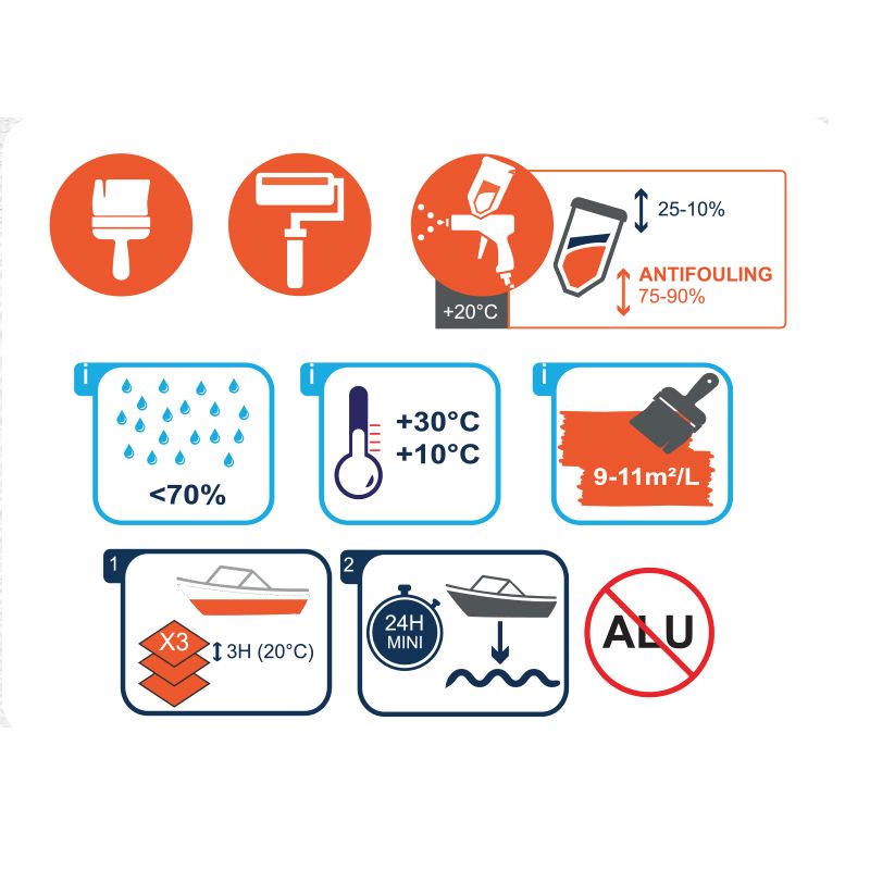 Attention : ne convient pas aux coques aluminium (utiliser un antifouling spécifique aluminium).