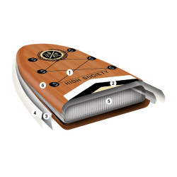 Le paddle est livré sous forme de pack complet, incluant une pagaie, un leash, une pompe, un sac de transport, un manuel d’utilisation et un kit de réparation. À mettre à l'eau dés la réception ! Il y a un élastique de rangement à l'avant et à l'arrière, pour emporter les affaires.