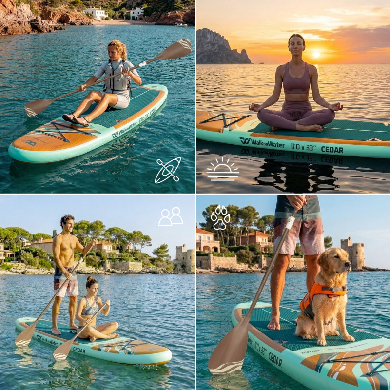 Sa capacité de charge maximale de 170 kg permet d’envisager des sorties à 2 avec un enfant à l’avant ou un animal de compagnie, dans un programme axé sur la promenade et le plaisir de naviguer ensemble. Son format 11’0 apporte un bon compromis entre glisse, équilibre et confort de déplacement.
