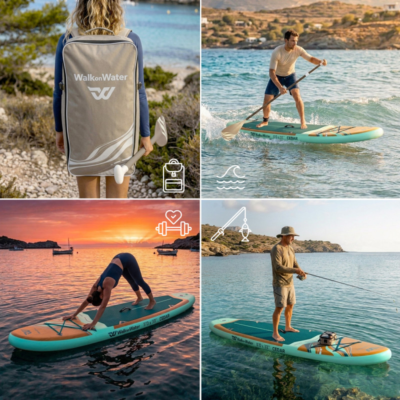 Le WOW Cedar 11.0 se distingue par son esthétique effet bois, plus chaleureuse qu’un paddle gonflable au design classique. Son look travaillé, ses finitions visuellement plus esthétiques et son aspect plus abouti lui donnent une vraie présence visuelle et un rendu plus qualitatif qu’un paddle gonflable standard.