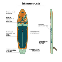 Pack complet prêt à naviguer : planche, pagaie, pompe, leash, aileron, sac de transport et kit de réparation inclus.