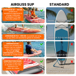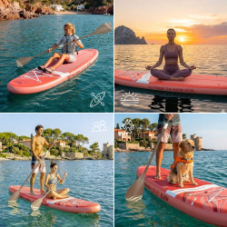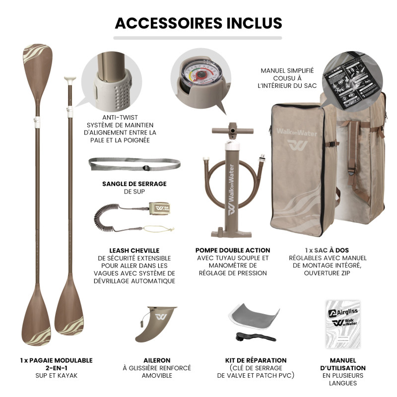 - Pack comprenant : planche, pagaie 2 en 1, leash, pompe, sac de transport, aileron, kit de réparation