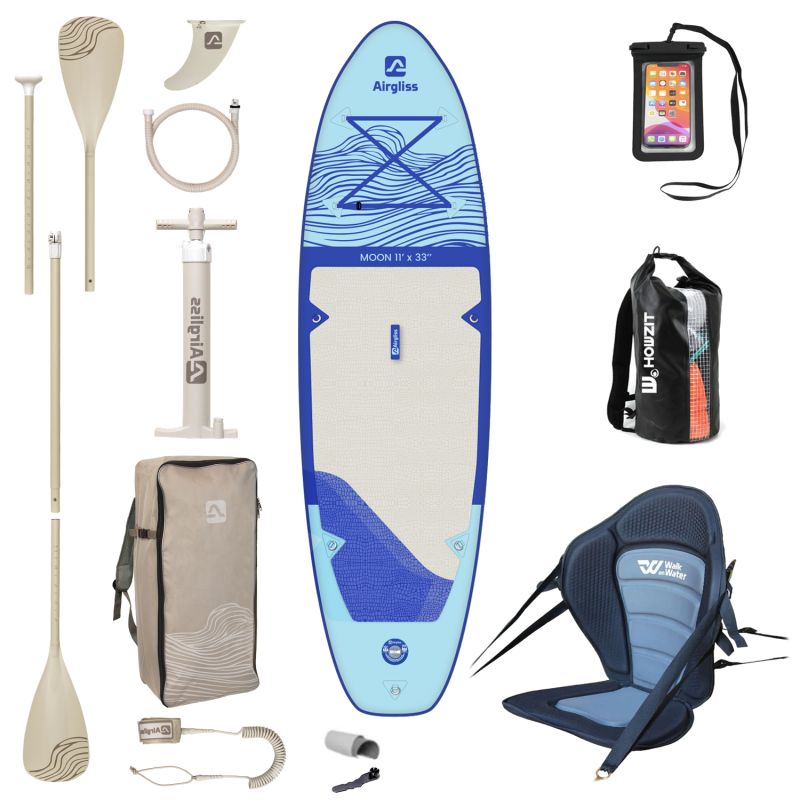 Ce pack associe un paddle gonflable Airgliss Moon 11’0 avec un dosseret kayak et des solutions étanches pour sécuriser vos effets personnels.