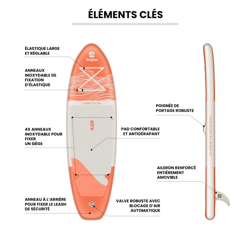 Ce pack associe un paddle gonflable Airgliss Comet 11’0 avec une pompe électrique, un dosseret kayak et des solutions étanches pour vos affaires.